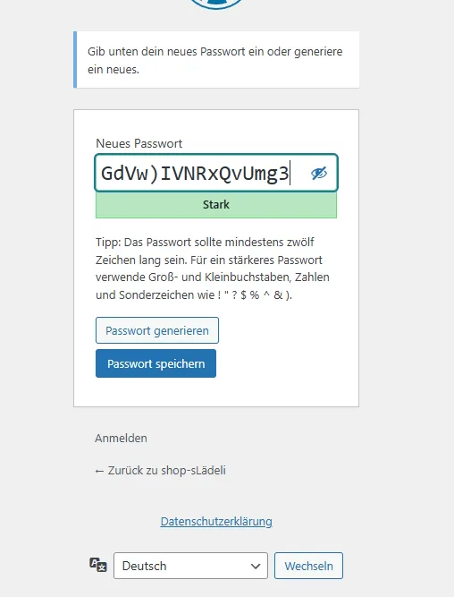 erhaltenen Link öffnen und generiertes Passwort speichern oder eigenes eigeben